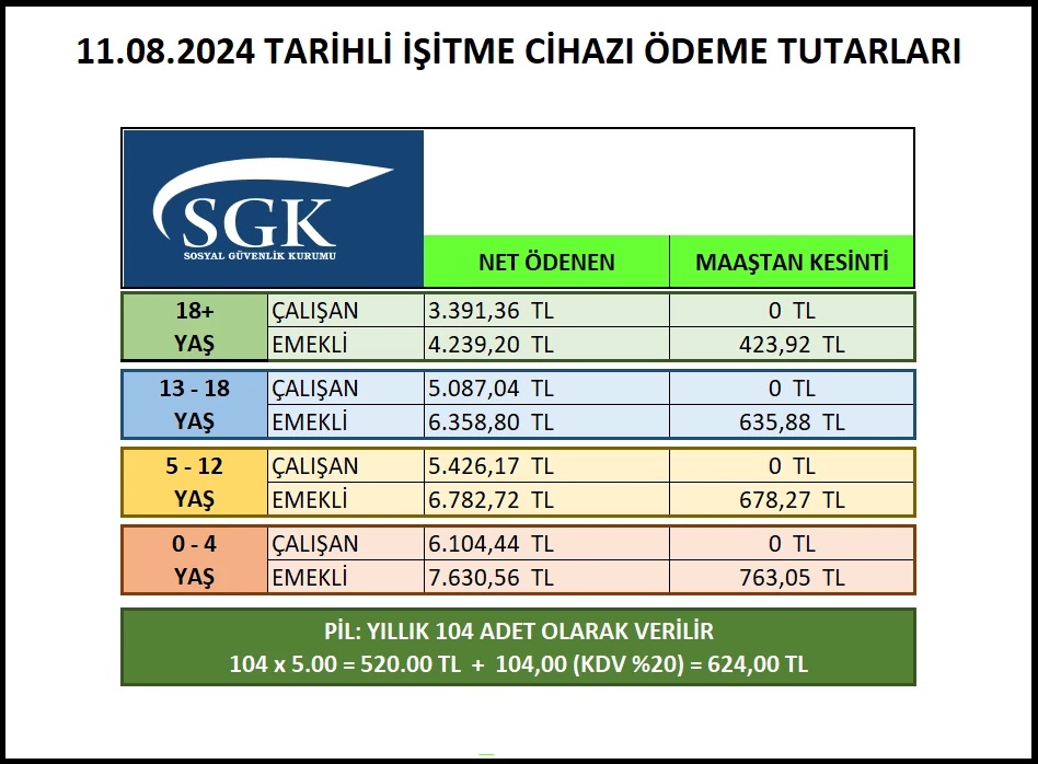 Sosyal güvenlik kurumunun yukarıdaki ödeme tutarlarından yararlanmanız için devlet ya da üniversite hastanesi olmak kaydı işe heyet raporu çıkartmak zorunludur.  Firmamızın SGK ile anlaşması olması sebebiyle seçilen işitme cihazı fiyatından SGK ödeme tutarı düşülerek kalan fark tahsil edilmektedir. Yukarıdaki işitme cihazı ödeme tutarları yılda ya da iki yılda bir güncellenmektedir.